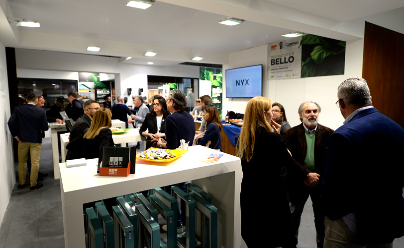 Un ambiente che accoglie i visitatori in un connubio tra natura e architettura: l’immagine verde dettata dalle foglie, su pannelli retroilluminati, in abbinamento con le finiture Corten e la verniciatura delle pareti divisorie color bianco caldo. All’interno i prodotti Nyx esposti in corner ambientati come spaccati di vita reale, indoor e outdoor. Non da un ultimo banqueting e bartender sempre attivi per far sentire a proprio agio in tutti i sensi i visitatori
